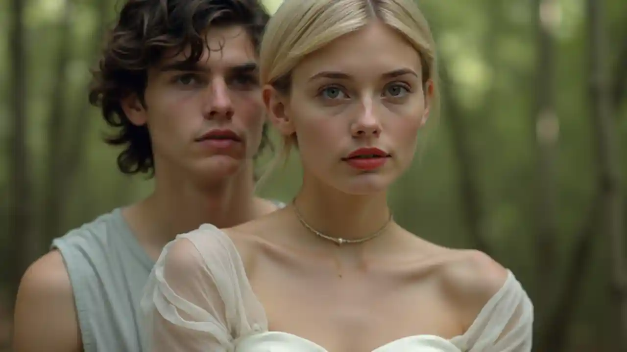 Picha hiyo inaonyesha vijana wawili wakiwa wamesimama karibu katika eneo linaloonekana kuwa la asili, labda lenye misitu. Mbele ya picha ni mwanamke kijana mwenye nywele fupi, nyangavu, na nywele nyeupe zilizochongwa kwa usahihi upande mmoja. Ngozi yake inaangaza kwa rangi laini, kama ya umande, na hivyo kuonyesha nyuso zake zenye kuvutia - mifupa ya mashavu iliyo wazi, midomo mikubwa yenye rangi nyekundu, na macho yenye kueleza mambo ambayo mtu anaona. Anavalia mavazi meupe yenye kuvutia yaliyofanywa kwa kitambaa cha hariri, na mikono mirefu ambayo huongeza ubora wa hali ya juu. Mshipi wa kushika mshipi wa kushika mshipi wa kushika mshipi wa kushika mshipi wa kushika mshipi wa kushika mshipi wa kushika mshipi wa kushika mshipi wa kushika mshipi wa kushika mshipi wa kushika mshipi wa kushika mshipi wa kushika Nyuma yake, akiwa amefichwa kwa sehemu lakini bado akionekana wazi, yuko kijana mwenye nywele nyeusi zenye maumbo na uso wenye kutokeza zaidi. Macho yake yanaelekea mbali kidogo na kamera, na hivyo kuongezea usanifu. Rangi ya ngozi yake inatofautiana na yake, na kuwapo kwake kunalisha picha nzima.