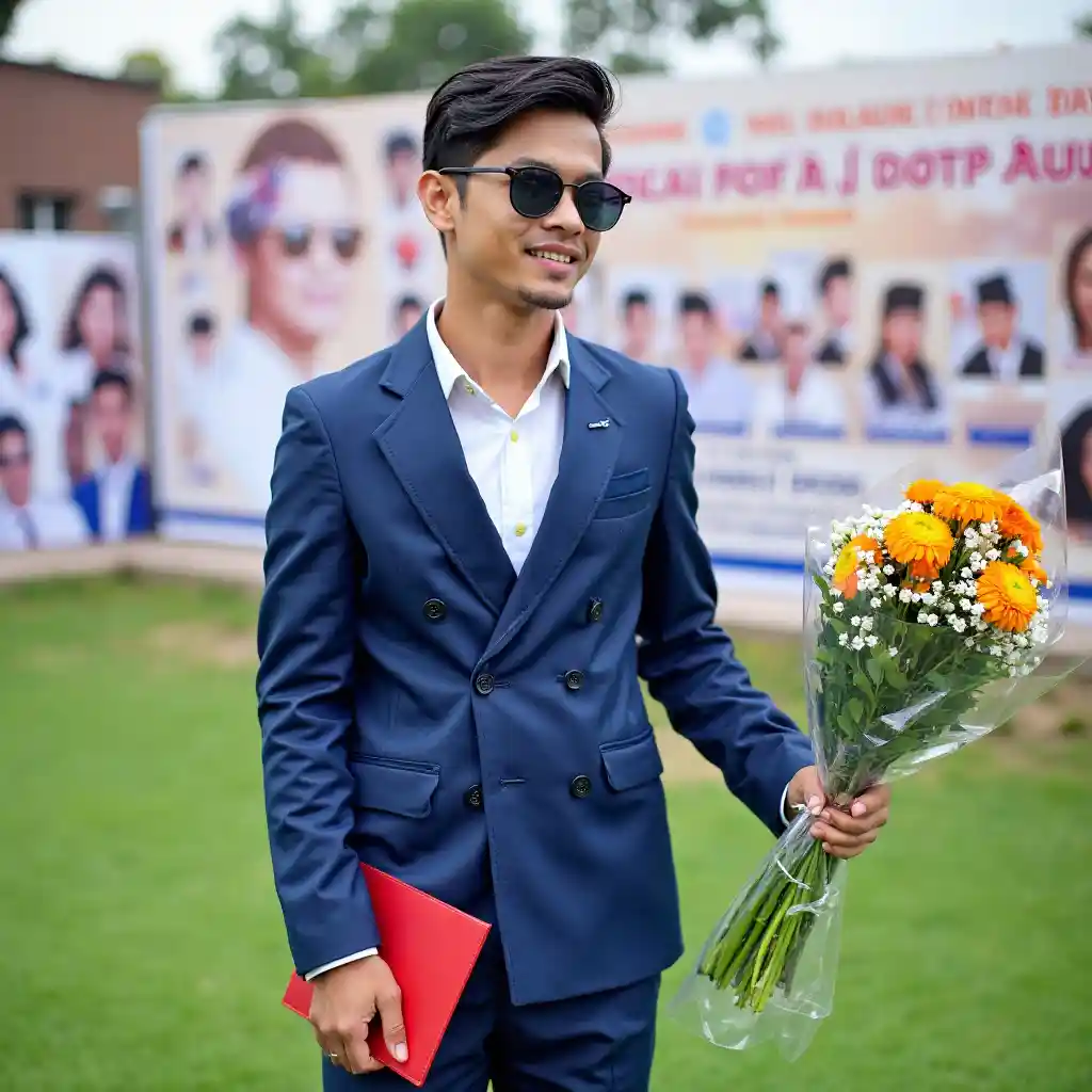 Kijana mmoja akiwa amevaa suti maridadi ya bluu na koti lenye vipaji viwili na miwani ya giza, anasimama kwa fahari katikati ya sherehe. Anabeba bouquet yenye kung'aa iliyofungwa katika plastiki safi na kupambwa kwa upinde unaong'aa, huku katika mkono wake wa pili, ana hati nyekundu, labda ikimaanisha mafanikio yake ya kielimu. Mazingira hayo yanaonyesha hali ya sherehe, ambayo inaonyeshwa na nyasi za kijani-kibichi. Nyuma yake, bendera na picha mbalimbali za wahitimu zinaonyesha tukio muhimu, labda sherehe ya kuhitimu. Hisia za watu huonyesha kwamba wamefanikiwa na wanajivunia mafanikio yao.