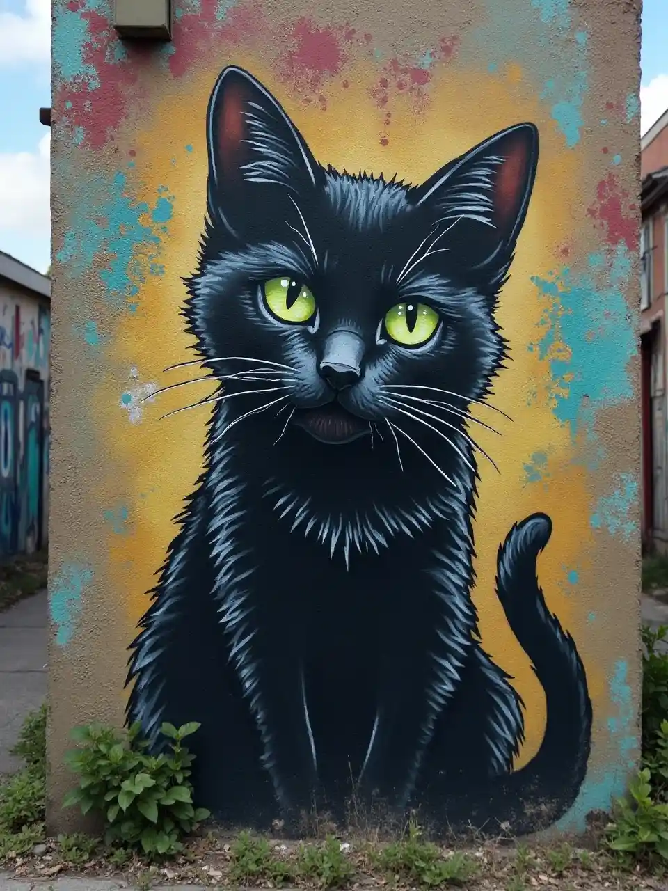 Ukuta katika Hood na paka nyeusi nzuri na macho ya kijani katika graffiti
