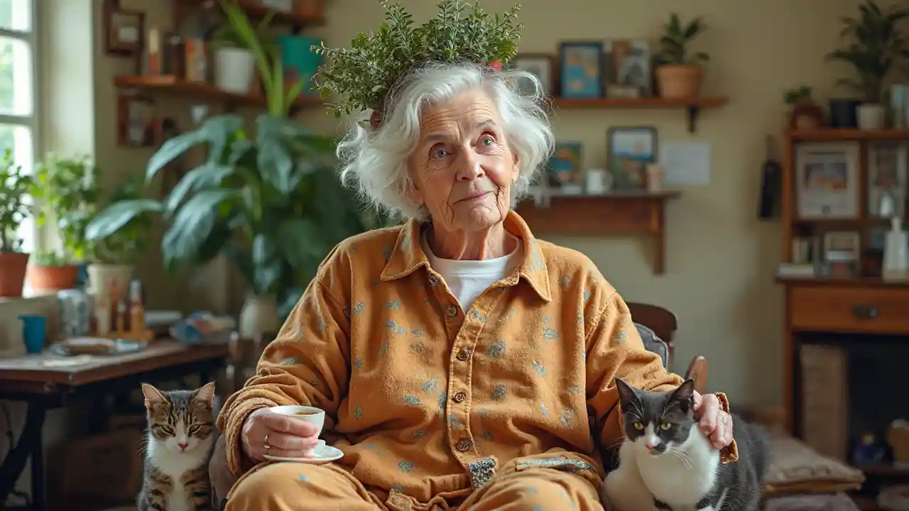 nyanya amevaa nguo oversized na mimea katika nywele zake kuzungukwa na paka na kahawa