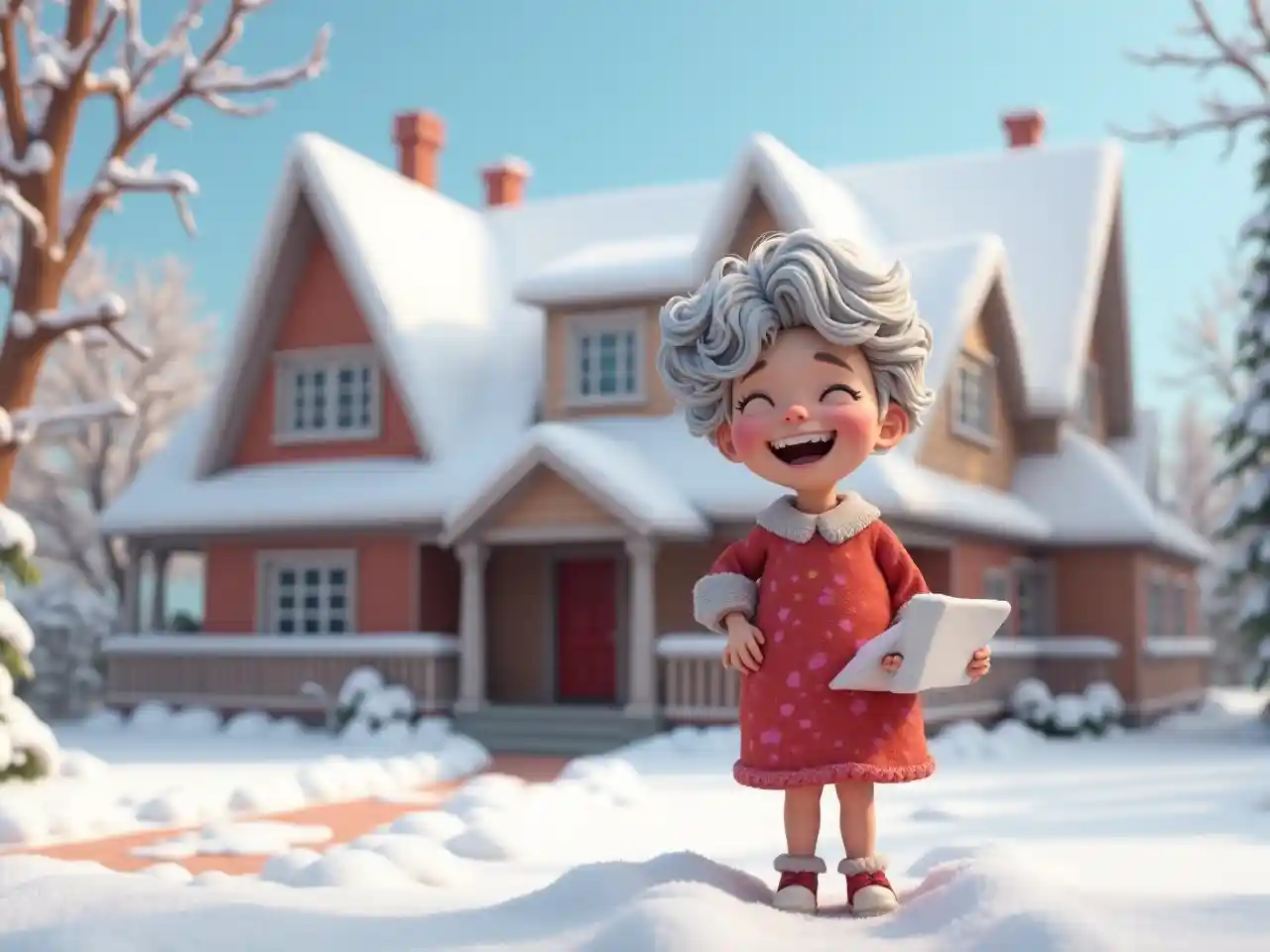 Nyumba iliyofunikwa na theluji na mtazamo kamili wa kichwa hadi mguu akicheka nyanya wa kike amesimama mbele ya nyumba kubwa mtindo wa Dr Seuss, akicheka nyanya Seuss, akibeba kompyuta, akivaa nyekundu na nukta za rangi ya bluu animation ya 3D katika BG whoville theme ya theluji, mtazamo wa mbali, kichwa hadi