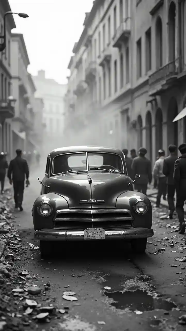 1952 Chevrolet ya Kijivu katika Ulaya iliyoharibiwa na vita