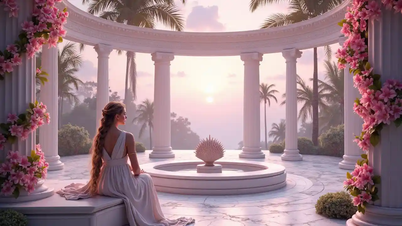 Colonnade ya mviringo nyeupe na nguzo za Kigiriki . Misitu ya machipukizi ya waridi inajipinda-jipinga kuzunguka nguzo hizo . Ndani ya mnara huo, mungu wa kike mrembo wa Ugiriki mwenye nywele ndefu zilizopambwa ameketi kwa uzuri kwenye benchi yenye marumaru meupe, akiwa amevaa mavazi meupe yenye rangi ya bluu, na bega lake likiwa na vibandiko vya dhahabu. Mkononi mwake ana konokono mkubwa wa Murex . Katikati ya mnara huo kuna chemchemi yenye sanamu . Mimea mingi ya kitropiki . Ukungu. Lilac na jua pink . Mawingu yaliyofurika . Nuru ya jua ya zambarau.