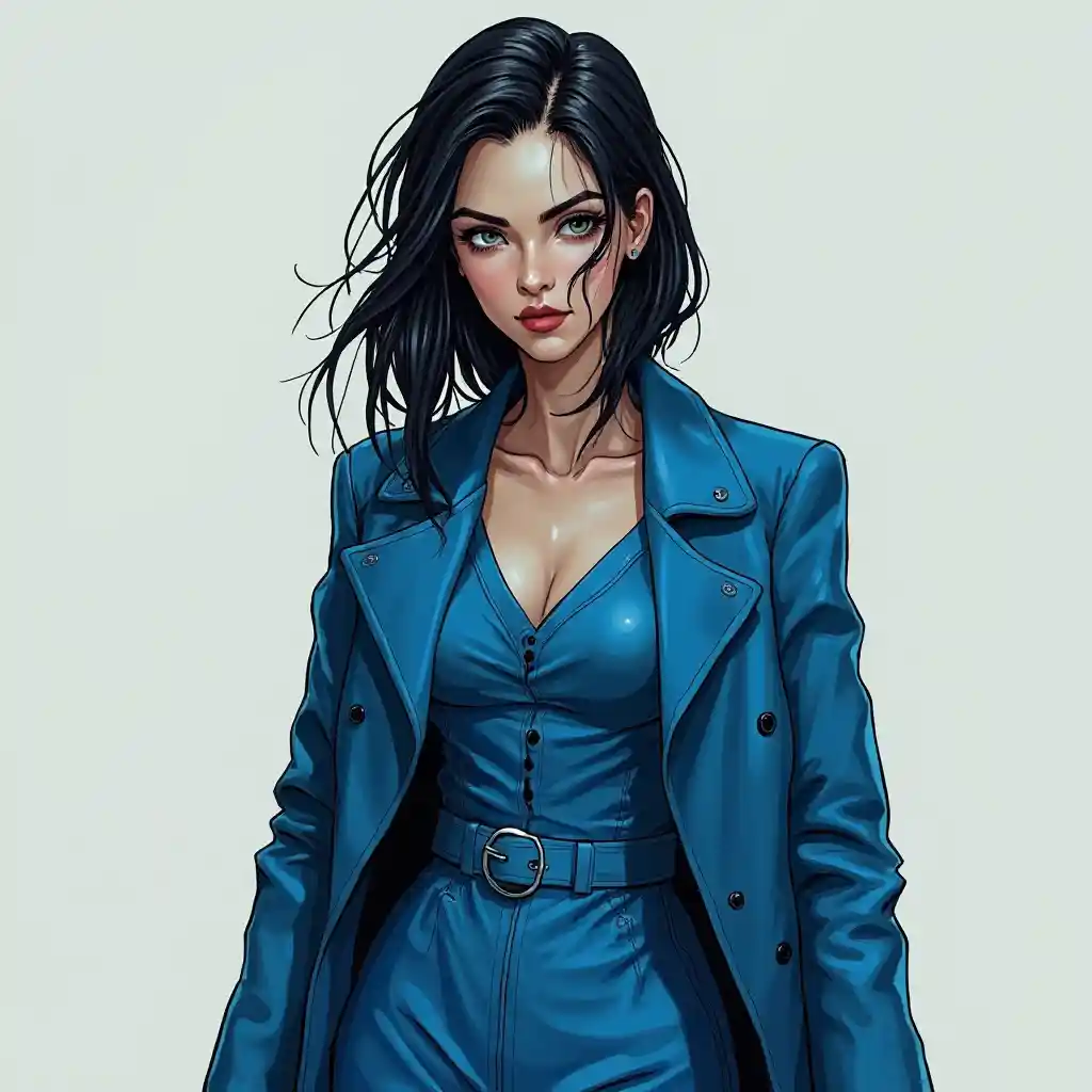 mwanamke charcator, mchanganyiko kati ya rasmi, sci fi style. yeye ina nguo mkali na nyongeza nyeusi. yeye kuvaa mavazi na koti. kila kitu ni grainy. Naweza kuona tabia nzima