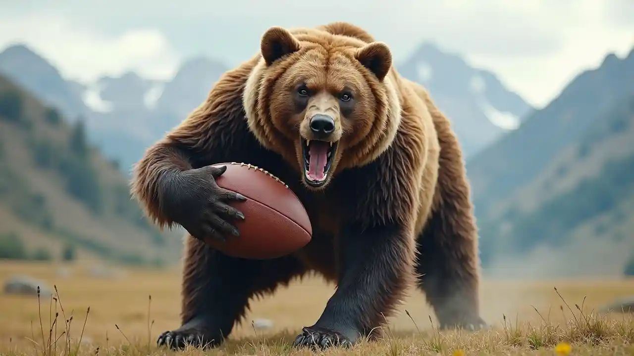 grizzly kubeba na kupiga kelele mpira wa miguu ya Marekani nguruwe ngozi na milima katika background