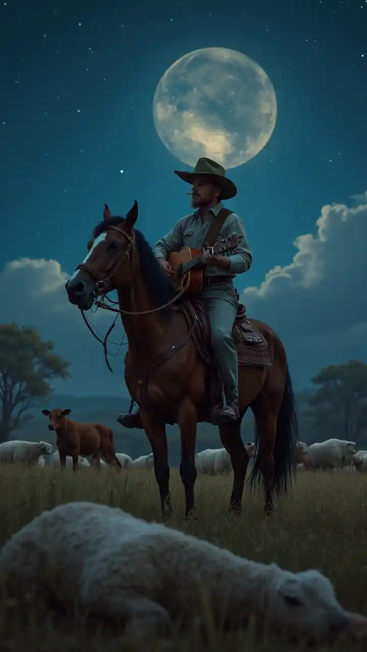 ANNA@J4x65EdDc1xtsbMS0Wgs yuko farasi akicheza gitaa na kuimba usiku na ng'ombe na kondoo wanaolala nyuma
