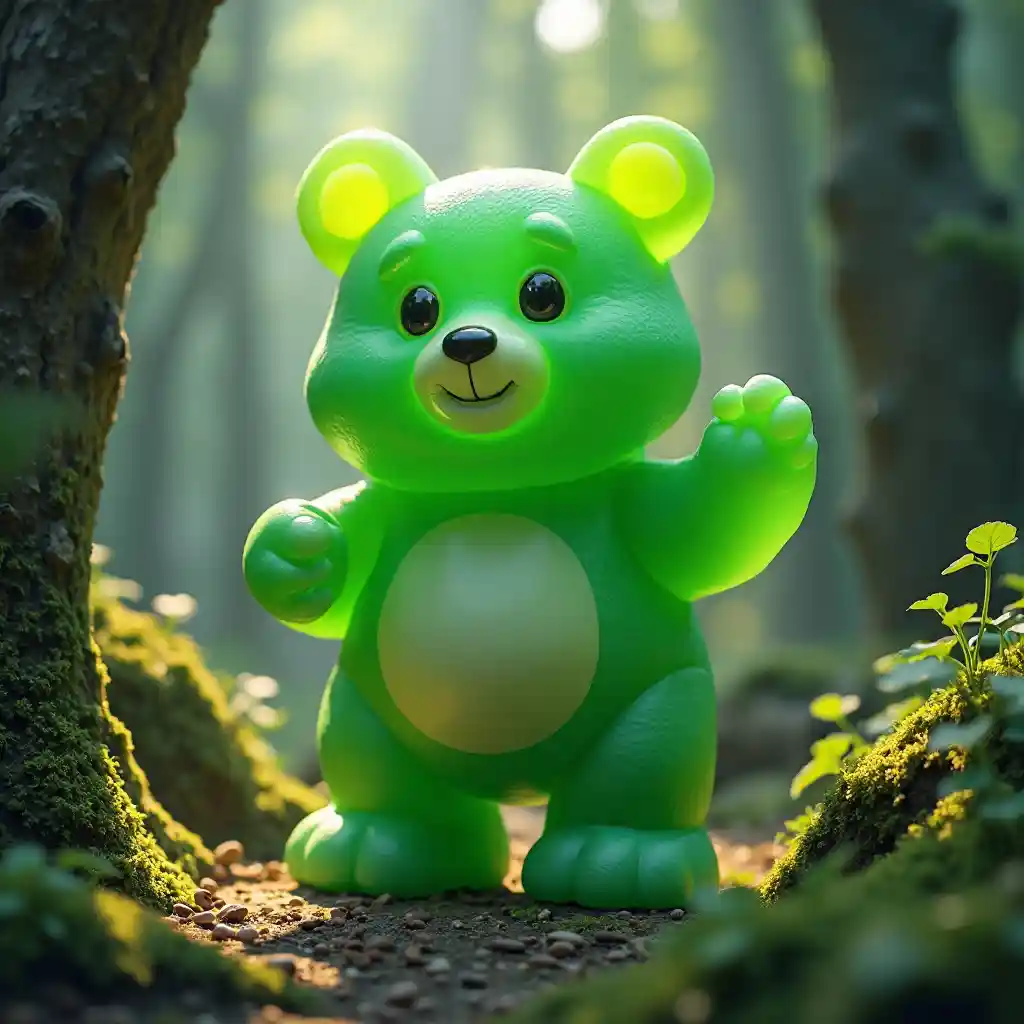 OliviaBig kijani gummy dubu katika Wonderland msitu, rangi mkali, kina sana, focus kali, Dramatic Lighting, fairytale