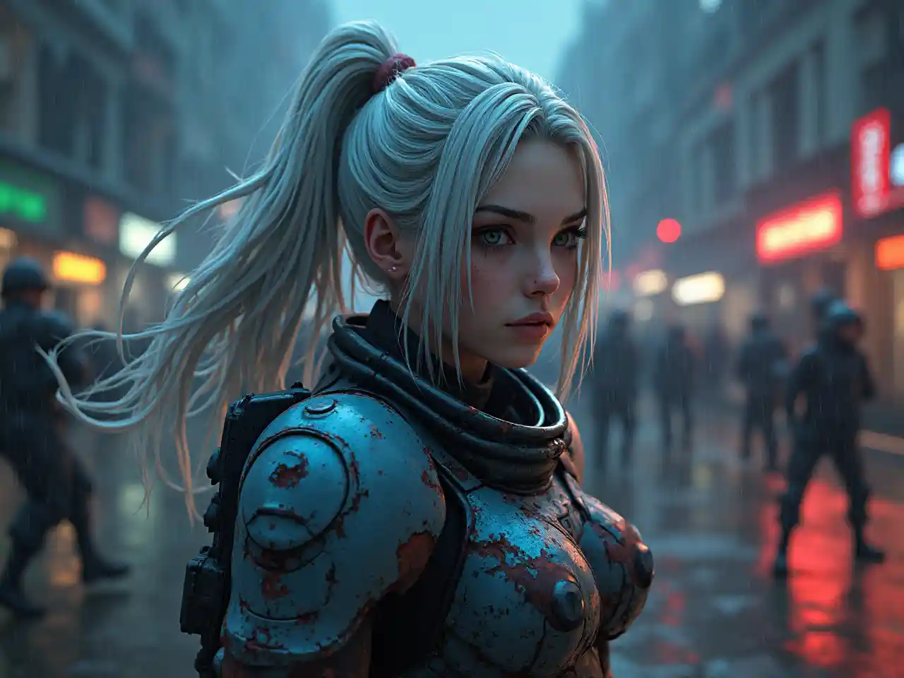Mandhari ya nguvu ya kukamata msichana katika vita-kuharibiwa Gundam silaha, nywele zake nyeupe amefungwa katika ponytail. Katika usiku wenye giza na mvua, mazingira yanakuwa yenye msukosuko wakati anapopigana kwa njia ya kihistoria. Alijeruhiwa kutokana na mapigano, mazingira yake yameonyeshwa kwa mtindo wa Borderlands, unaovutia ArtStation kwa maelezo yake ya juu na ubora wa sinema. Mazingira ni yenye kupendeza, na sehemu zenye kung'aa na laini zinaonyesha hali ya juu, ya kimungu, na ya kimbingu. Iliyoundwa kwa aesthetic ya manga-anime, eneo lina maelezo magumu na rangi za kupendeza, zilizoboreshwa na taa za sinema na umakini wa hyper. Kutumia uwezo wa Unreal Engine 5 na Lumen reflections kwa ajili ya athari CGI, 3D rendering huzalisha doll-kama ukamilifu, crafted na Octane kwa ultra-real. Licha ya vurugu zilizokuwapo wakati wa vita, muundo huo ni mzuri, unadumisha usahihi wa kiume na kuepuka mambo yaliyopotoka, na hivyo kuunda kipande cha muziki.