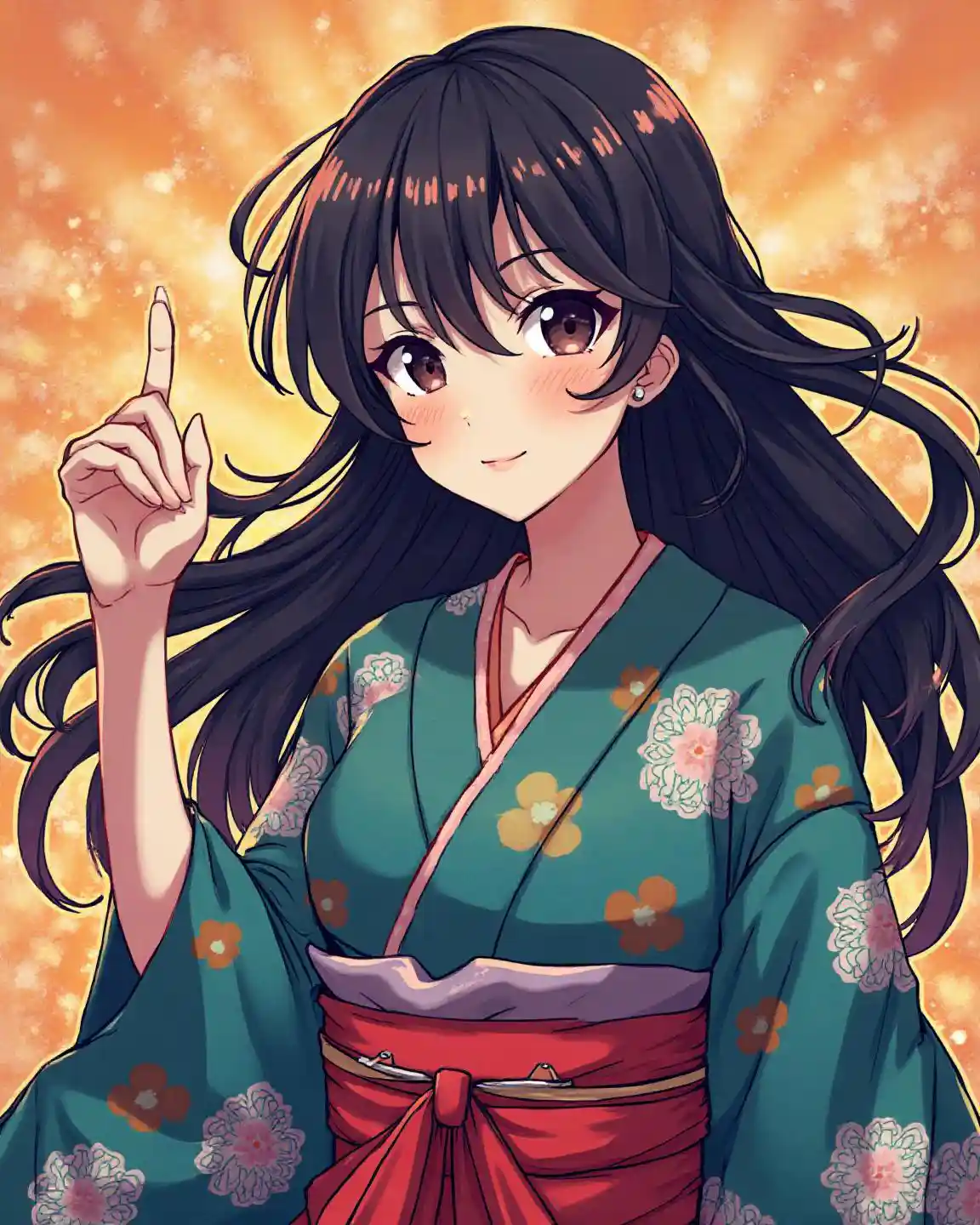 mtindo wa picha , mwanamke katika hakama , macho ya giza , nywele ndefu zinazoenea , tabasamu na midomo imefungwa , vidole vyenye picha nzuri , rangi za wazi , psychedelic , mgongo