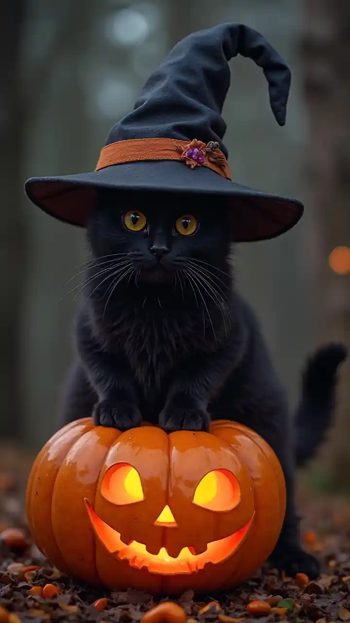 Paka Mweusi Mzuri wa Halloween Mwenye Kofia ya Mchawi