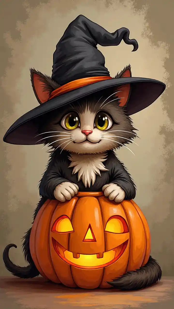 Cute Halloween Cat na Witch Hat na Jack O Lantern
