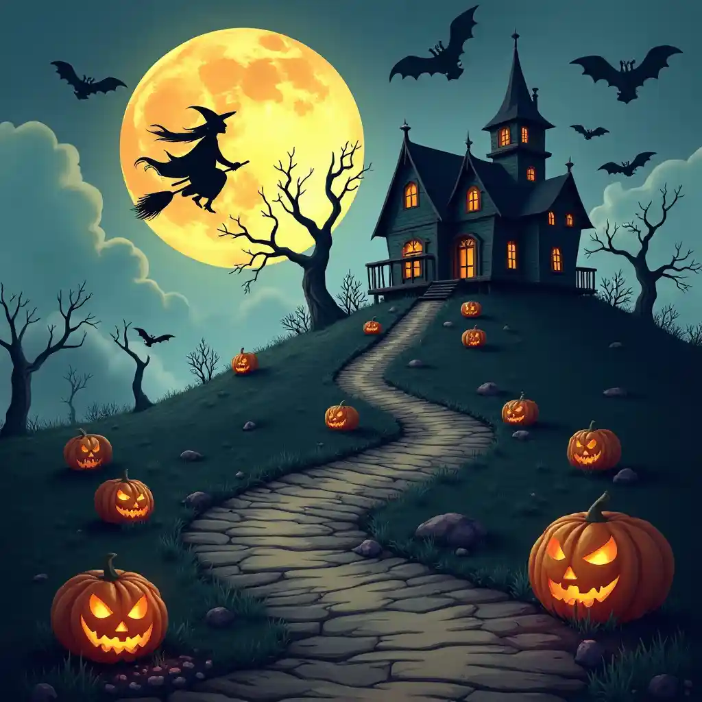 Mandhari ya Halloween yenye kutisha na mchawi juu ya ufagio akiruka mbele ya mwezi na nyumba kubwa yenye roho mbaya juu ya kilima na njia yenye kuongoza. Kuna taa kadhaa za kijani-kibichi zilizotawanyika, baadhi kwenye njia na baadhi kwenye kilima. Kuna popo wanaoruka angani na miti iliyokufa nyuma.