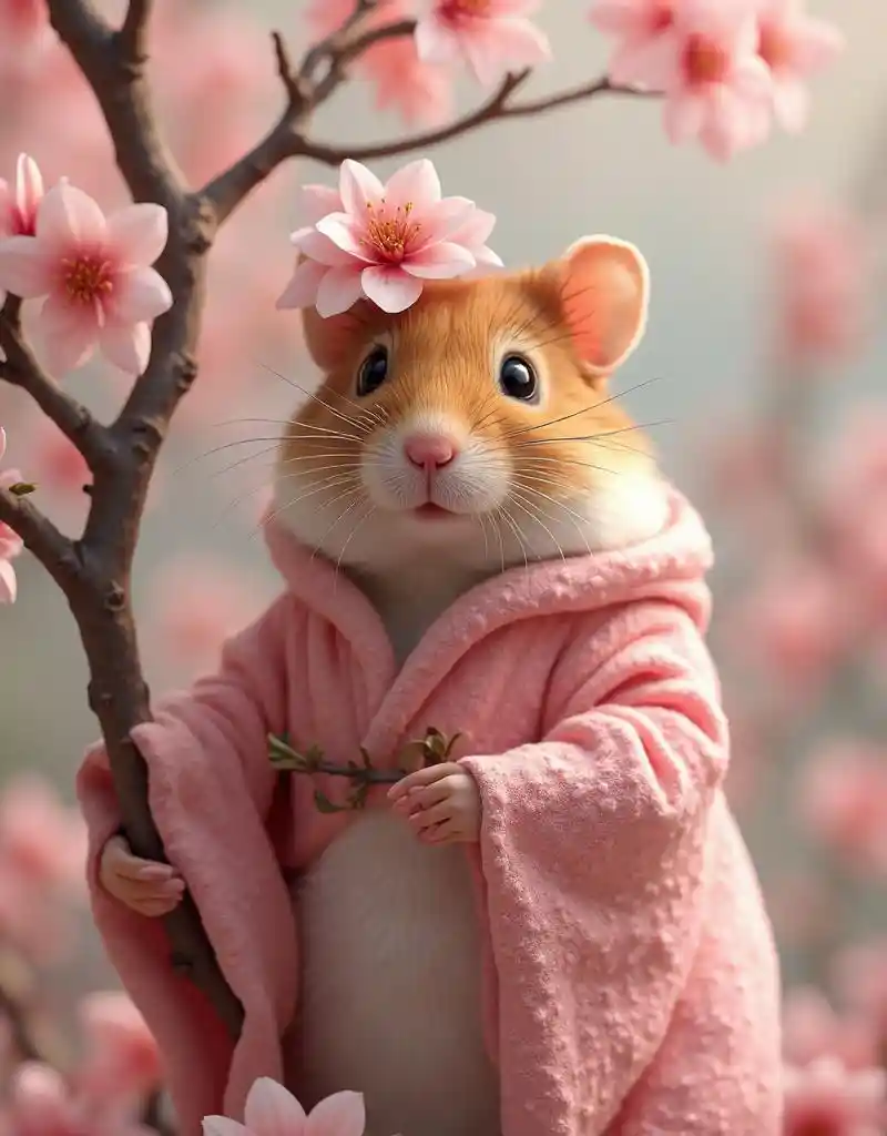 Wyattmasterpiece, ubora wa juu, photorealistic, kweli, kupiga picha, hamster amevaa kama cherry maua na mungu