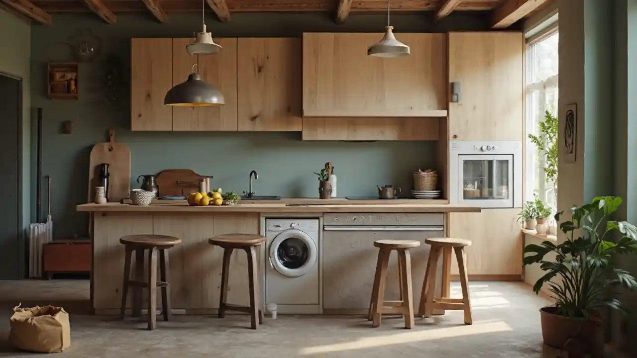Kuweka picha ya mume wa kukodisha, na zana na msingi wa jikoni.