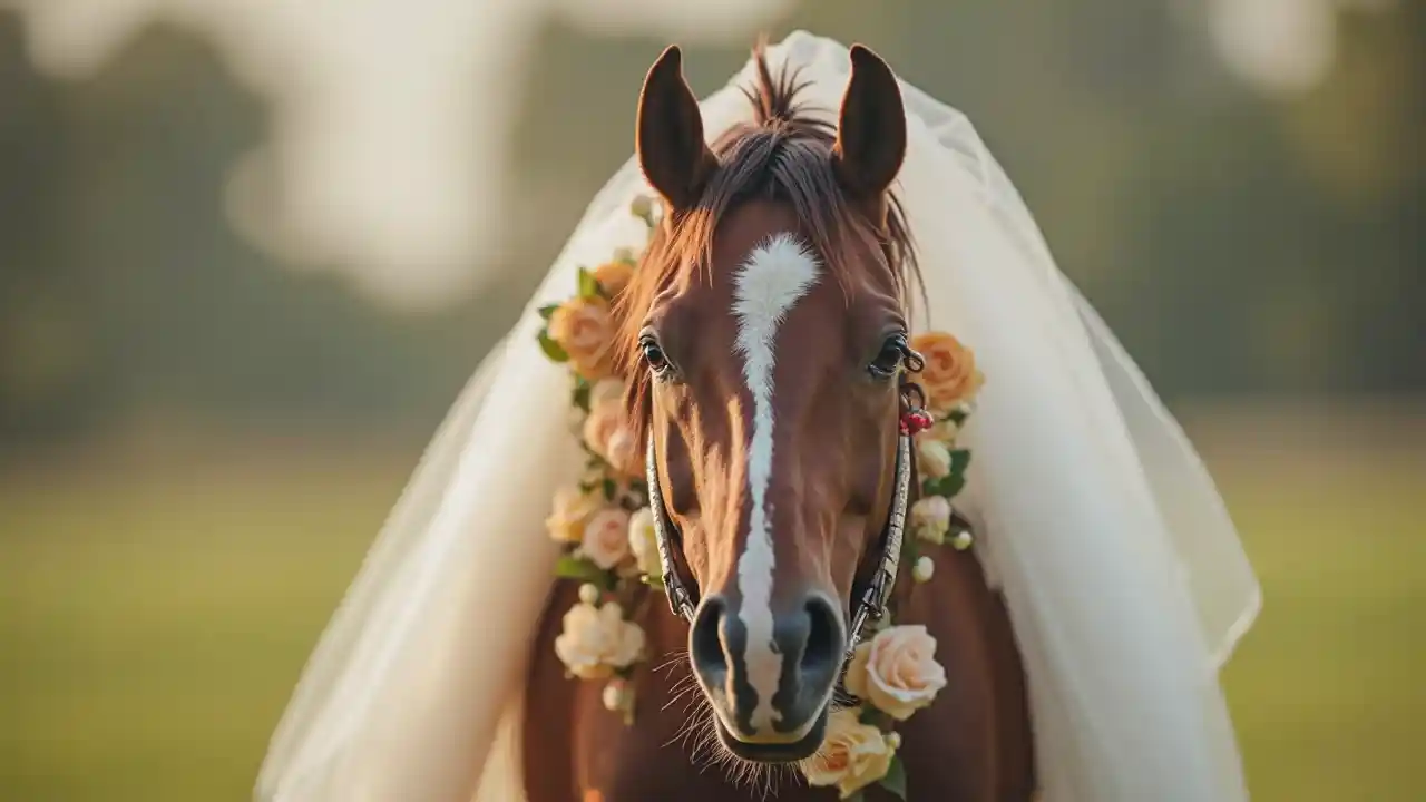 picha ya farasi mwenye furaha akiwa na pazia la arusi