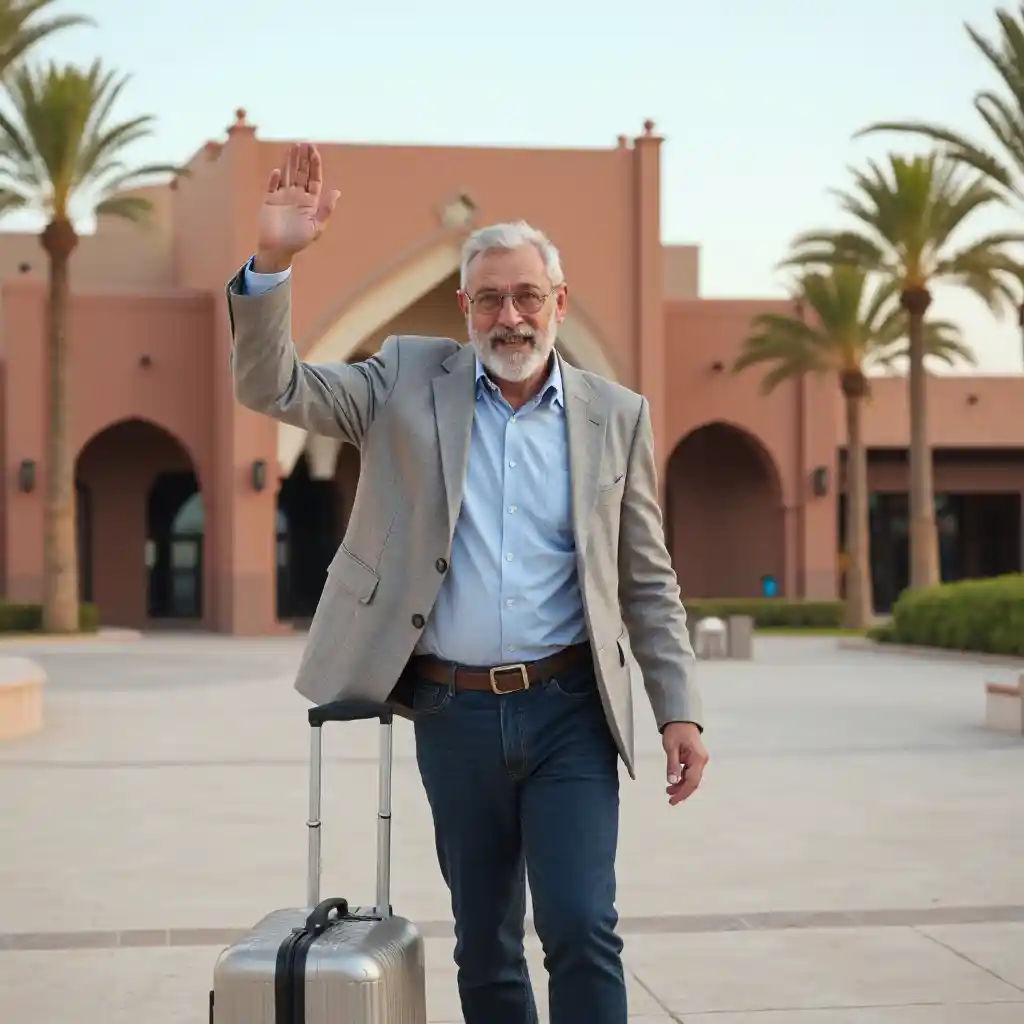 Mwanamume mwenye furaha mwenye ndevu nyeupe aliyevaa blazer ya kijivu juu ya shati ya bluu na jeans nyeusi, amesimama nje ya uwanja wa ndege wa Marrakech Menara. Anainua mkono mmoja kwa shauku huku akiongea kwa simu ya mkononi. Karibu naye kuna sanduku la rangi nyepesi, ambalo linaonyesha kwamba amefika au anaondoka. Usanifu wa Marrakech wenye msukumo wa Morocco unaonekana nyuma, na mifumo yake ya jiometri, na mchanganyiko wa vipengele vya kisasa na jadi. Miti ya mitende imejipanga kando ya njia ya kufika kwenye kituo cha ndege, na jua lenye joto la Afrika Kaskazini linafunika eneo hilo. Mtu huyo anaonekana kuwa na msisimko, labda akimsalimu mtu anayemwona au kumwambia habari njema kuhusu kuwasili kwake nchini Morocco. Mazingira ya uwanja wa ndege yanatofautiana na eneo la kisasa lenye lami.