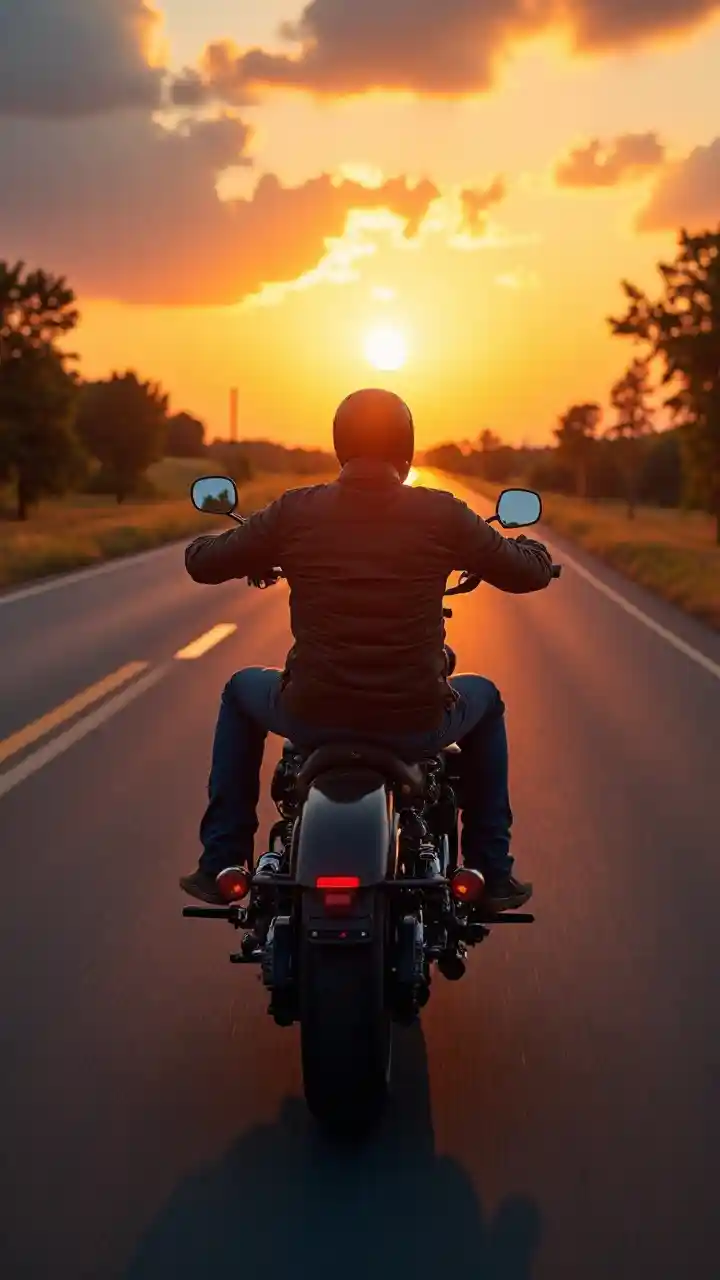 BellaHarley Davidson pikipiki kuendesha chini ya barabara kuu katika machweo