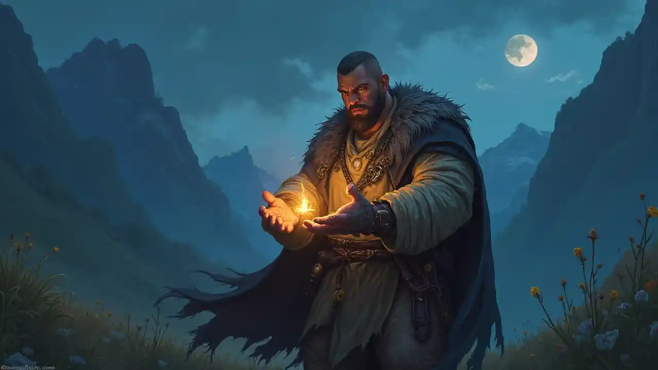 (Torso) Kiume stocky nzito kuweka kubwa fit kuhani na nywele fupi na ndevu, kifua nywele, akitoa uponyaji-mchawi nje ya mikono, katika bonde upepo usiku, njia ya, d & d mazingira, kuboresha kivuli ubora, rangi