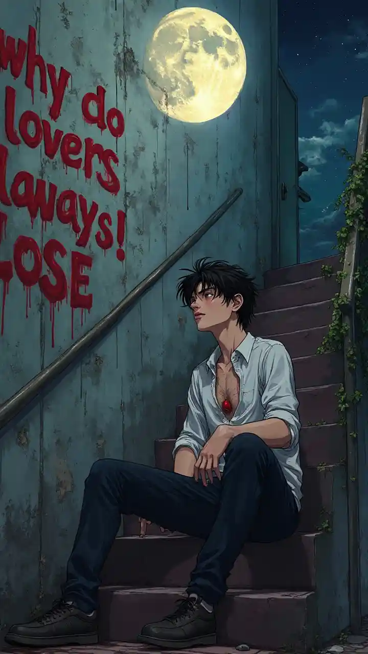 Kijana ameketi kwenye ngazi, huzuni machoni, shati lake jeupe ni mvua b damu kuja kutoka eneo la moyo wake. kuangalia juu ya mwezi pamoja na kichwa chake