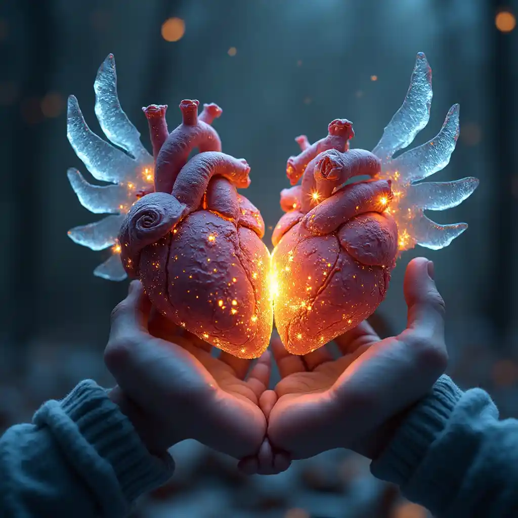 (Mioyo yetu, kama nyororo kama mabawa ya dhoruba ya barafu, kupumua kwa upole, rhythmic beat, kutafakari mwangaza wa moto, usiku wa manane. Tunapokuwa pamoja, mioyo yetu huungana katika muundo mmoja, unaoshirikisha, unaowakilisha kiini cha upendo na uzuri wa asili.) Mioyo miwili ya kibinadamu, iliyounganishwa kwa njia tata na kuunganishwa pamoja na nguvu za asili, kana kwamba inaonyesha wazo la nafsi au moto wa mapacha. Mandhari hiyo huamsha hisia za uchangamfu, uchawi, na uzuri wa asili.