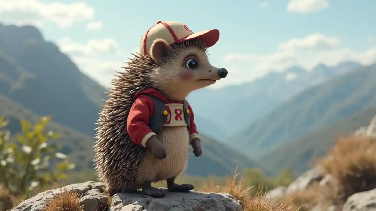 Hedgehog amesimama juu ya mlima kuvaa kofia ya besi beji kwenye nguo inayoandika RIZO