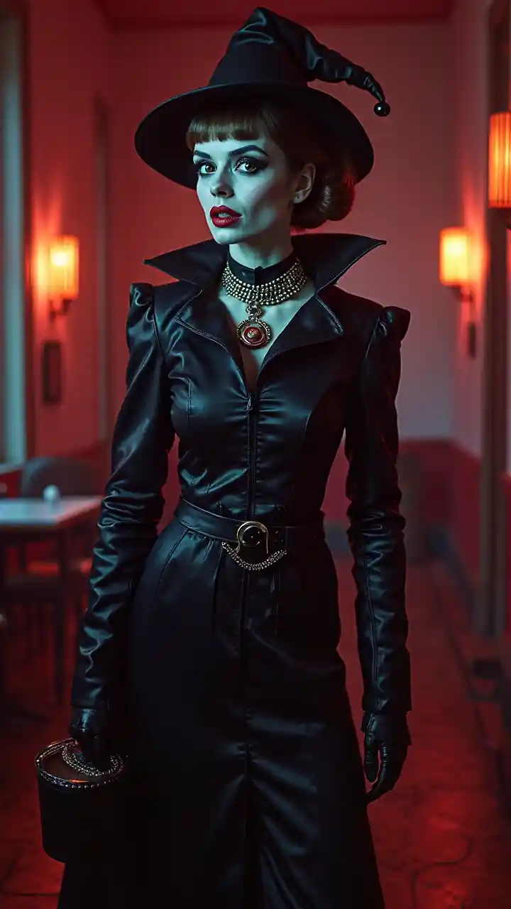 Audrey Hepburn kama tabia mbaya katika Halloween costume spooky, Vivid rangi, Tofauti rangi