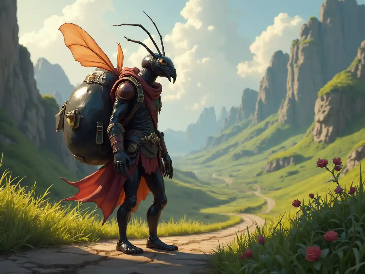 Ant symbiosis (DND tabia adventurers), na kuvutia nyuso nyeti, (maelezo nyeusi shell), kusimama kwa ujasiri juu ya barabara winding kuzungukwa na mashamba lush, (mchango mkubwa wa ajabu) slung juu ya bega, medieval fantasy anga, rangi ya kupendeza mazingira, (angle dynam), mwanga wa kupoteza umbo, kuwasilisha mazingira ya kiume, ya kina, ya kufikiria.