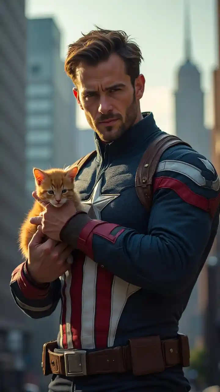 (Chris Evans kama Kapteni Amerika full body shot), anabeba mtoto mdogo wa paka katika mkono wake, taa ya kuvutia ili kusisitiza maelezo, rangi yenye kutafakari utaifa, msimamo wa nguvu, mandhari ya mji, anga ya nguvu na huruma, ubora wa 4K.
