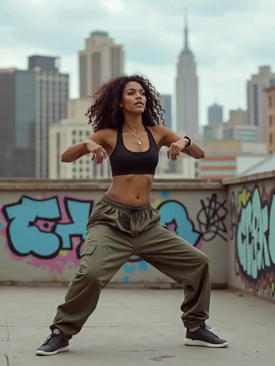 EmeryMwanamke mweusi mwenye nguvu katika miaka yake ya 20 anacheza muziki wa hip kwenye paa la jiji, bra yake ya michezo na suruali za mizigo ikionyesha nguvu zake, na graffiti na minara ya juu ya ardhi.