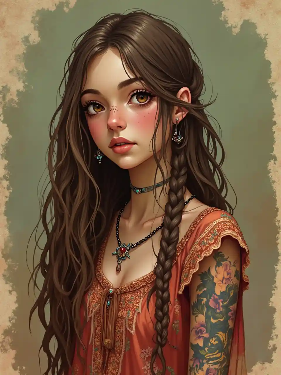 kufanya 70s hippie msichana na nywele za kahawia. mkono wake wa kushoto ina tattoo sleeve. yeye ina dreadlocks chini ya nywele zake amevaa style bohemian kama hippie. macho hazel.
