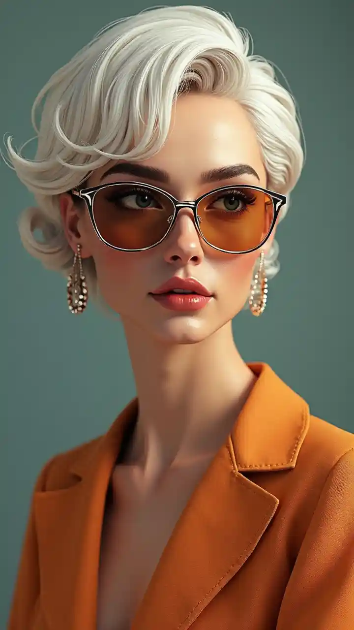 Picha ya mwanamke mzuri mtindo wa miaka ya 40 yo na nyeupe platini nywele fupi na miwani kubwa, glamorous Hollywood picha, kweli sana, daz3d, wanawake wabunifu, azimio la juu, sana, rangi, mavazi kama mwanamke kijana