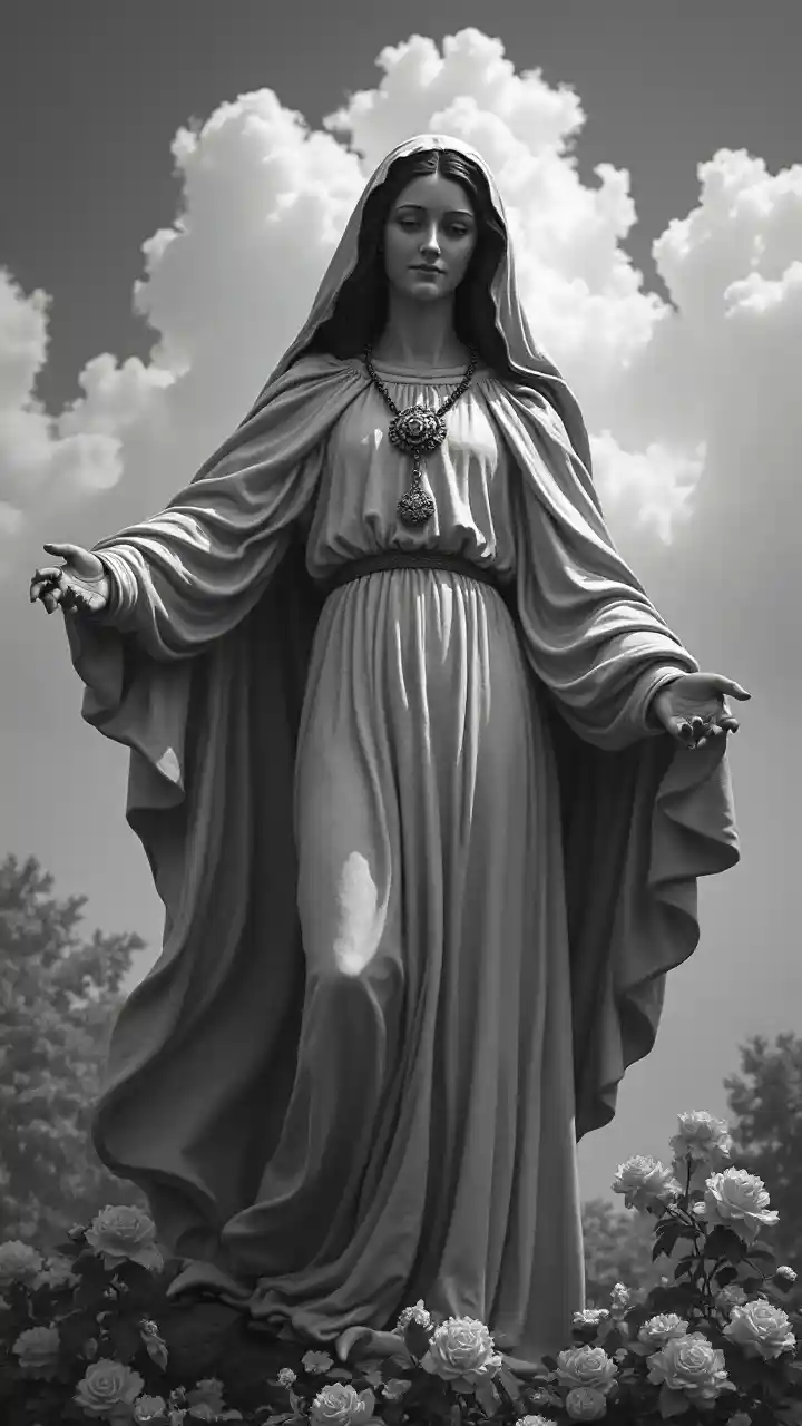 Scarlettbikira mary kushikilia mkufu wa waridi angani, nyeusi na nyeupe