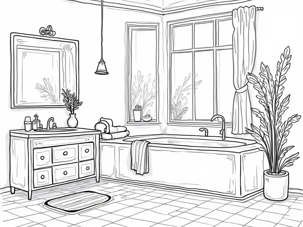 Kujenga bold line sanaa whimsical picha ya ndani katika nyeusi na nyeupe na mistari bold na ngazi ya juu ya uwazi, ya ukubwa mdogo starehe watu wazima chumba cha kuogea hygge cozy style, akishiriki na ubinafsi na kona kubwa kuogea, towels, cozy dirisha pazia na gorofa, picha ya kina, cartoon style