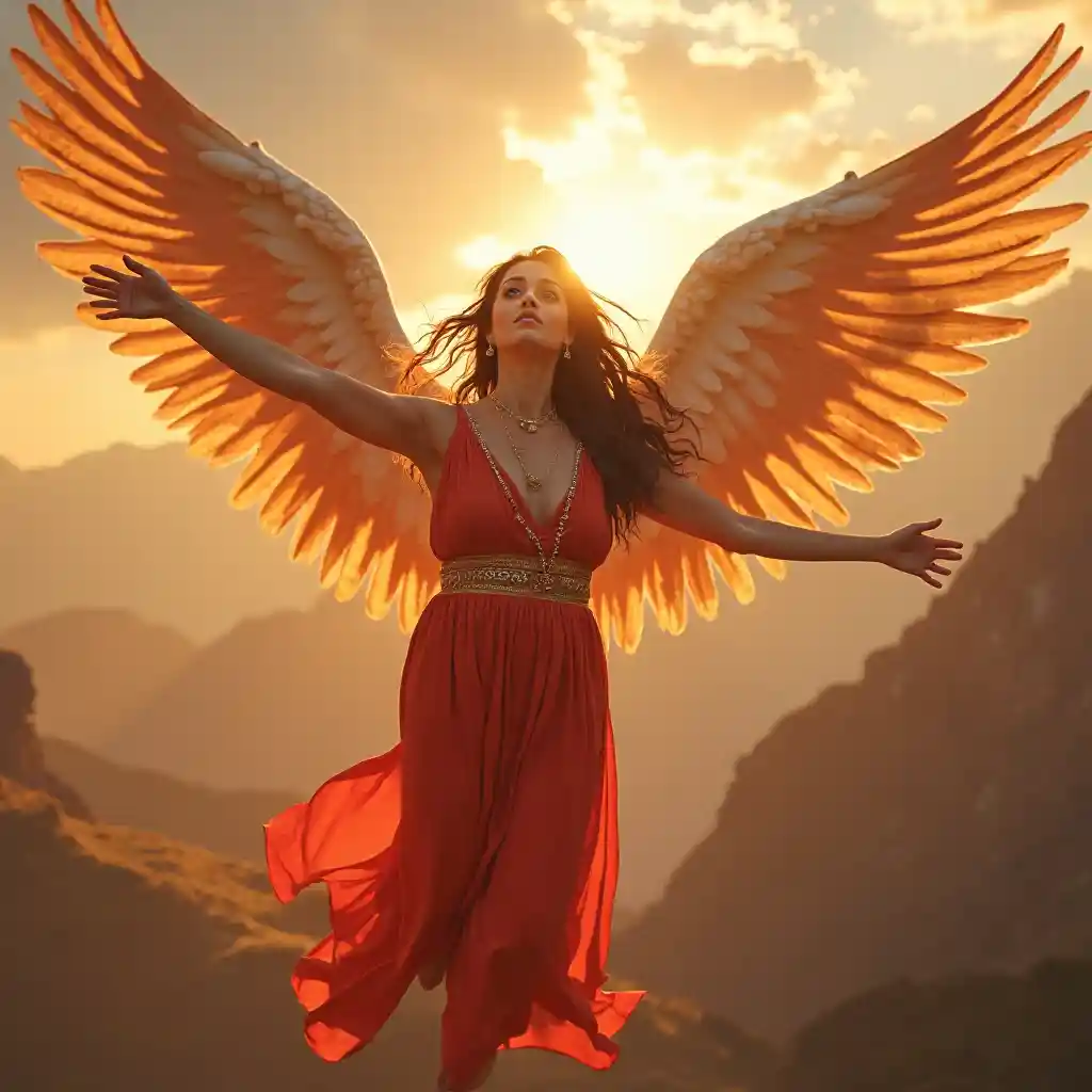 mwanamke Malaika wa upendo kuruka angani, full mwili mtazamo, hyper kweli, rangi nyekundu dhahabu, style kichawi. vibes chanya, nishati mlipuko katika background, mwanga angani, jua, mkali, utukufu, ajabu, epiki, shujaa, kina sana Amerika ya Kusini uso wa binadamu, uso kamili kuangalia mbele, Peru machu pichu, uso sahihi, macho kamili, ngozi hyper kweli, ngozi ya kina, hyper realistic, hyper focus, mikono kamili, uso kamili