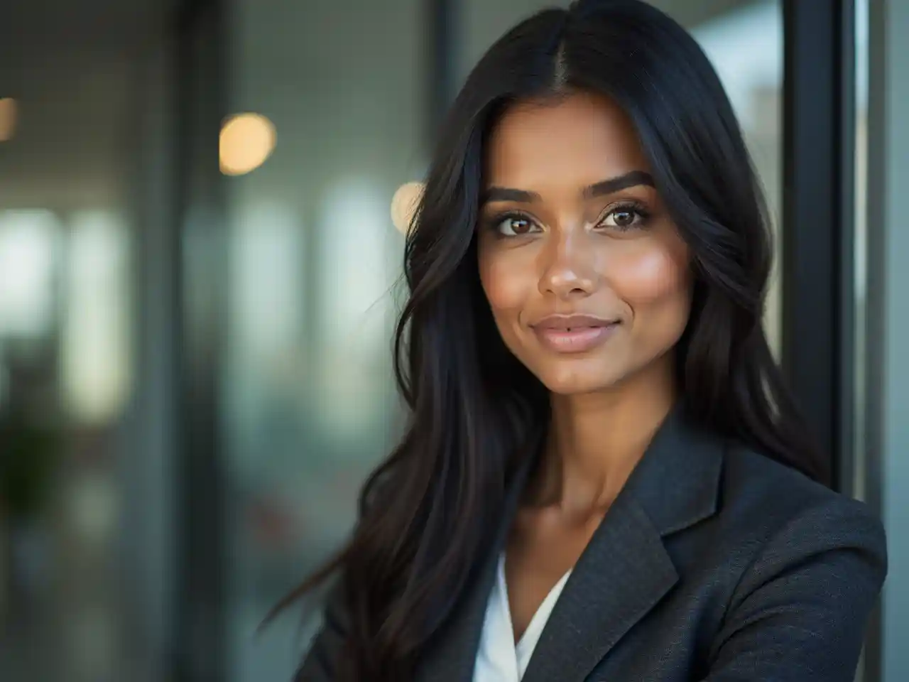 Picha halisi ya mwanamke wa kiume mwenye umri wa miaka 25 wa India akiwa amesimama kwa upole mbele ya kamera akiwa na nywele ndefu nyeusi na macho ya kahawia, akiwa amevaa mavazi ya biashara, picha ya mwili, 8k hdr, maelezo mengi, ubora wa juu, yeye huangaza ujasiri na taaluma, ikiangazwa na mwanga wa asili katika mazingira ya ofisi.