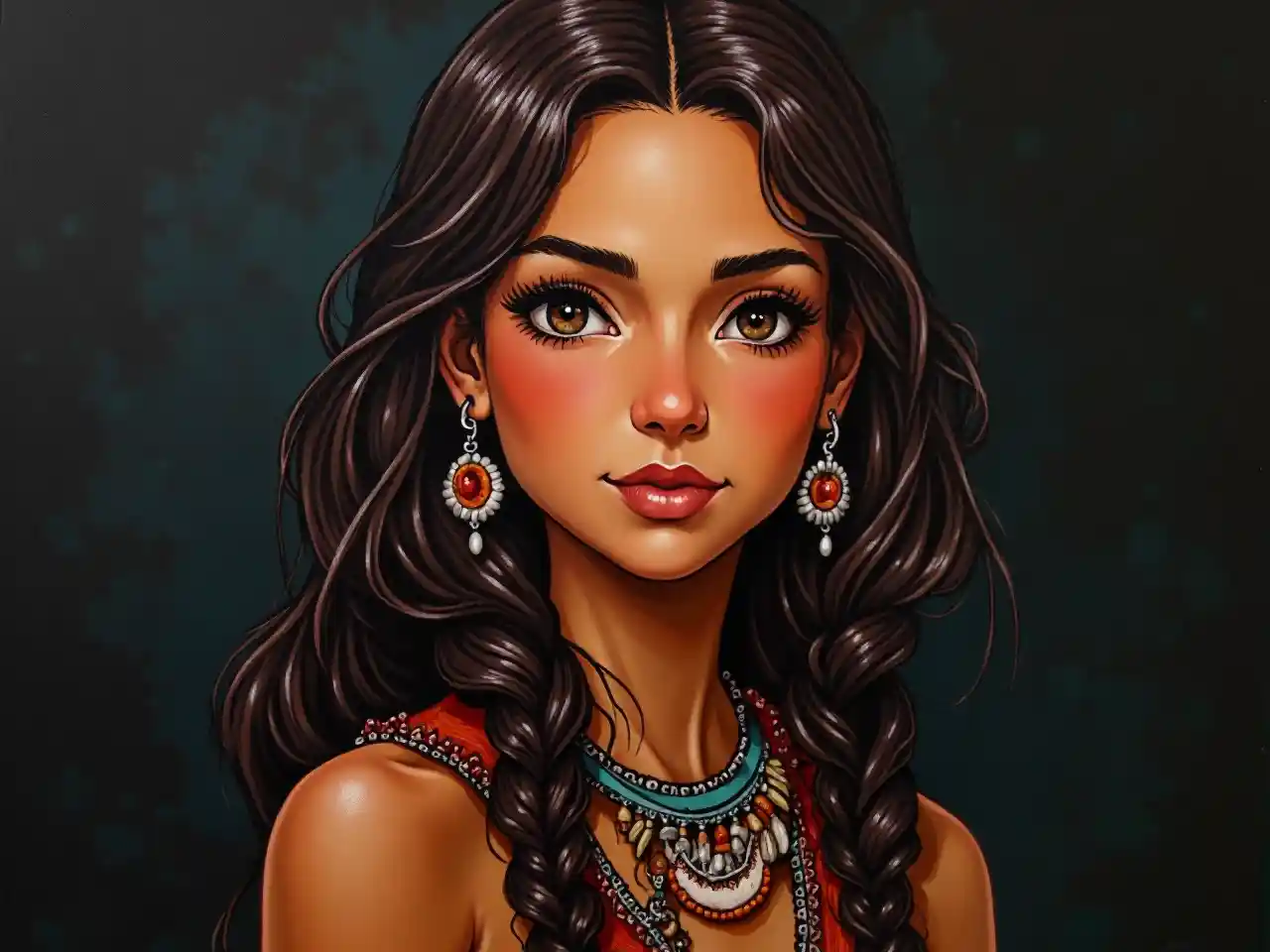 American Indian msichana juu ya background nyeusi, picha, mafuta style, comics, tu rangi