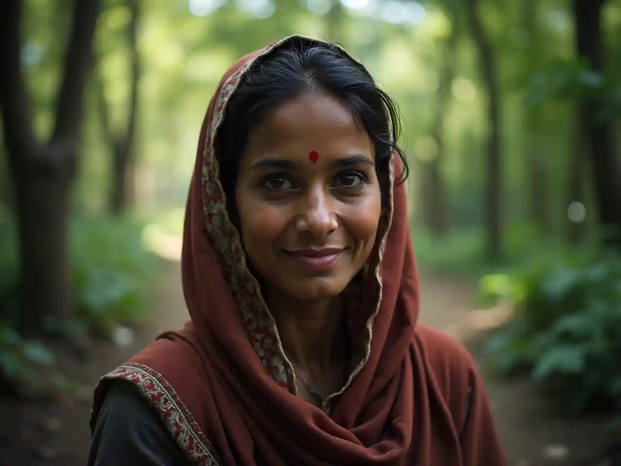 picha ya mwanamke wa kijiji wa India katika msitu katika Himachal Pradesh, wazi nyuso , picha ya kweli, sinema, 35 mm lenses , f/1.8, emphasis lighting,global illumination-uplight-v4