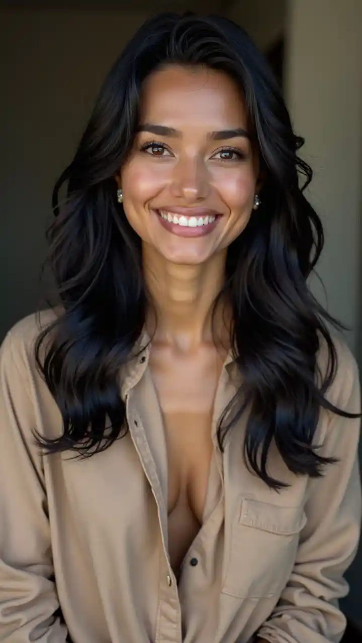 mwanamke wa Indonesia, akiwa amevaa shati lisilo na vifungo, akitabasamu, na nywele ndefu nyeusi