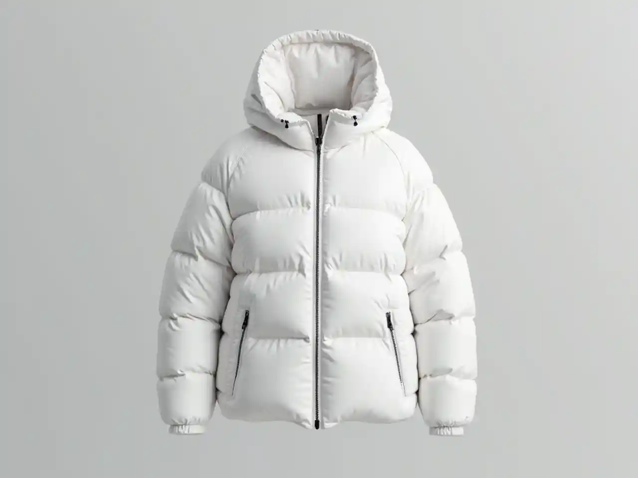 Inflatable nyeupe minimalist wanawake puffer koti, uwazi, kutengwa, background kijivu, mockup