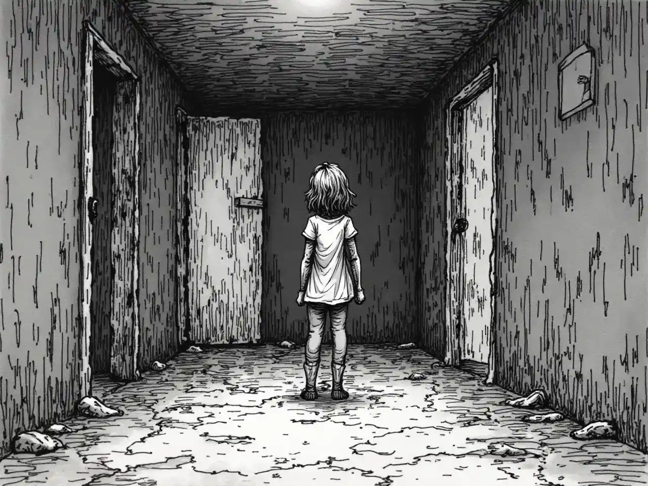 Picha ya kalamu, ya kina kidogo, ya msichana aliyefungwa kwenye pishi.