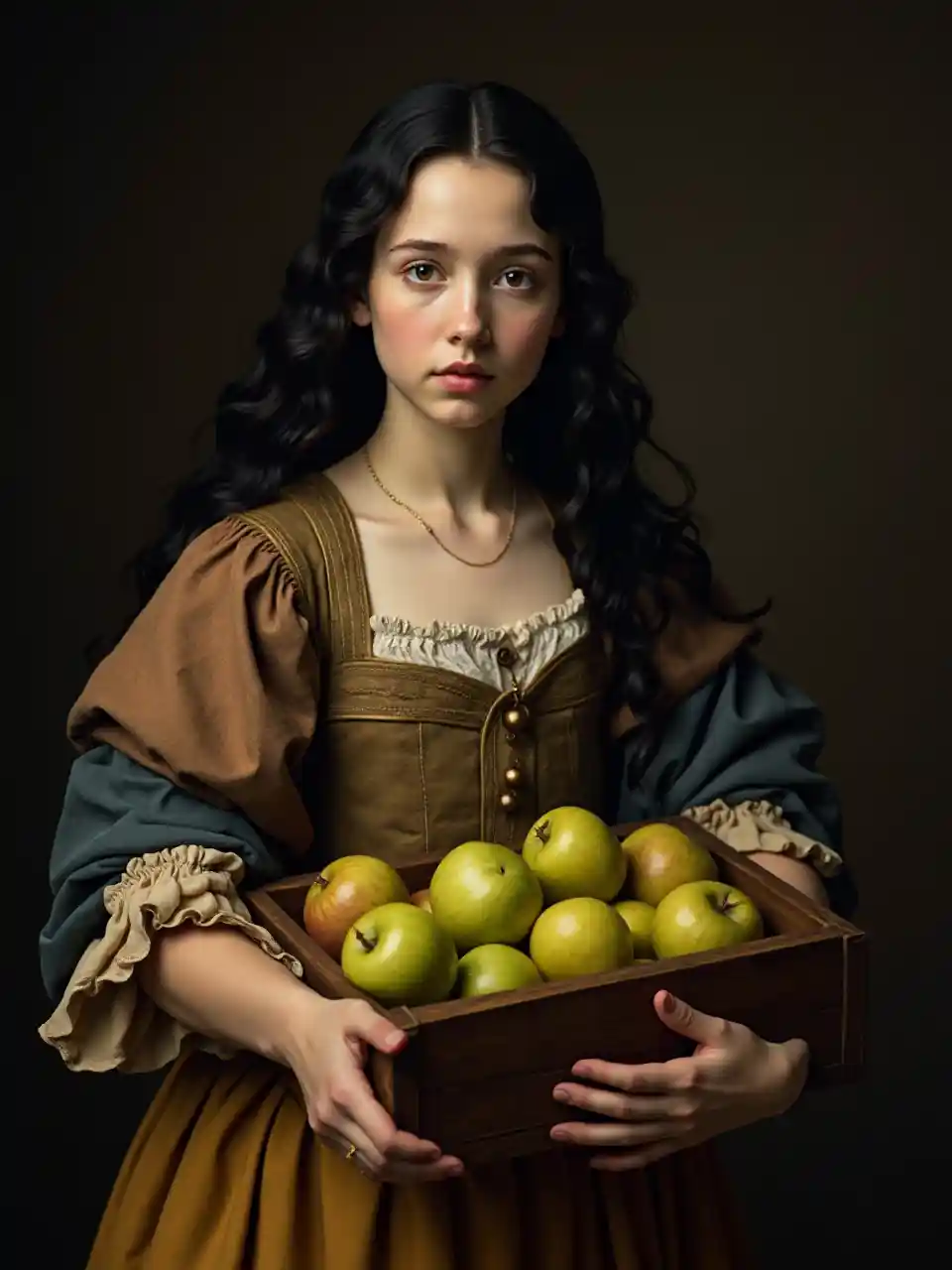 Picha ya msichana Mwitaliano aliyevaa mavazi ya karne ya 17 akiwa na sanduku la mazao yaliyoiva. Maembe yana rangi ya kijani na umbo linalofaa. Sanduku hilo limetengenezwa kwa mbao nyeusi zenye rangi nzuri. Msichana ana nywele ndefu nyeusi