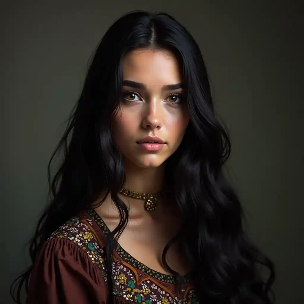 Nywele ndefu nyeusi. Macho ya kijani-kibichi. Wanawake vijana. Mwili wa Kiitaliano. Mavazi ya jadi ya wanawake wa Mexico.