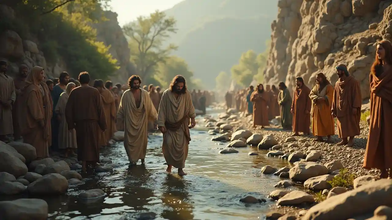 Yesu akiwa amezungukwa na umati kando ya mto wenye mawe