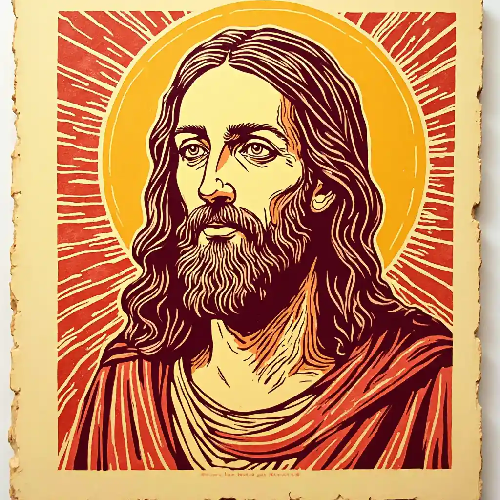 Yesu katika Woodcut linocut wino muhuri block picha, mstari nyembamba, misaada, katika mstari sanaa style, Nyekundu na njano, inaonekana mbao maelezo, high detail