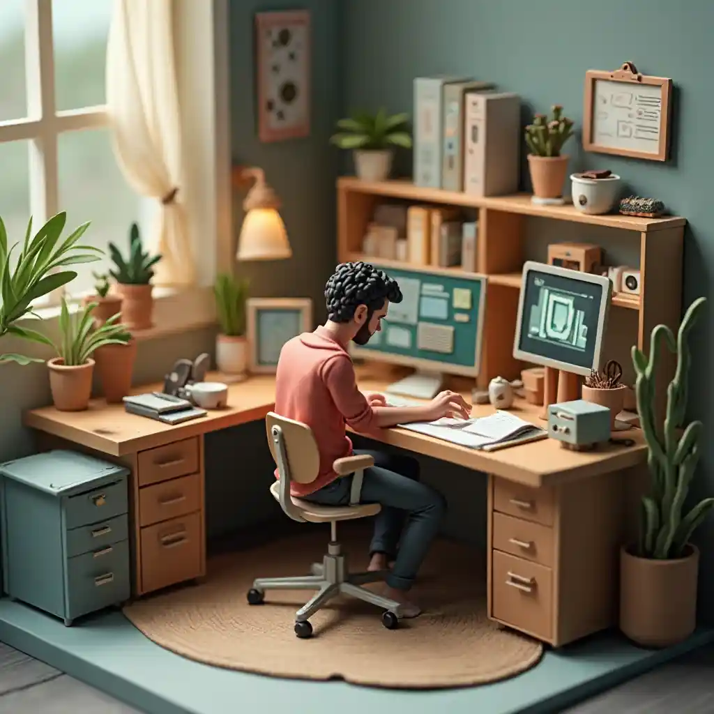 kuunda diorama ya 3D ya miniature ya mbuni wa graphic ameketi kwenye dawati lake jina lake ni jihed bjaoui ana miaka 28 , mazingira yanapaswa kutafakari nafasi ya kazi ya mtaalamu ni pamoja na vifaa vidogo na mapambo ambayo tabia