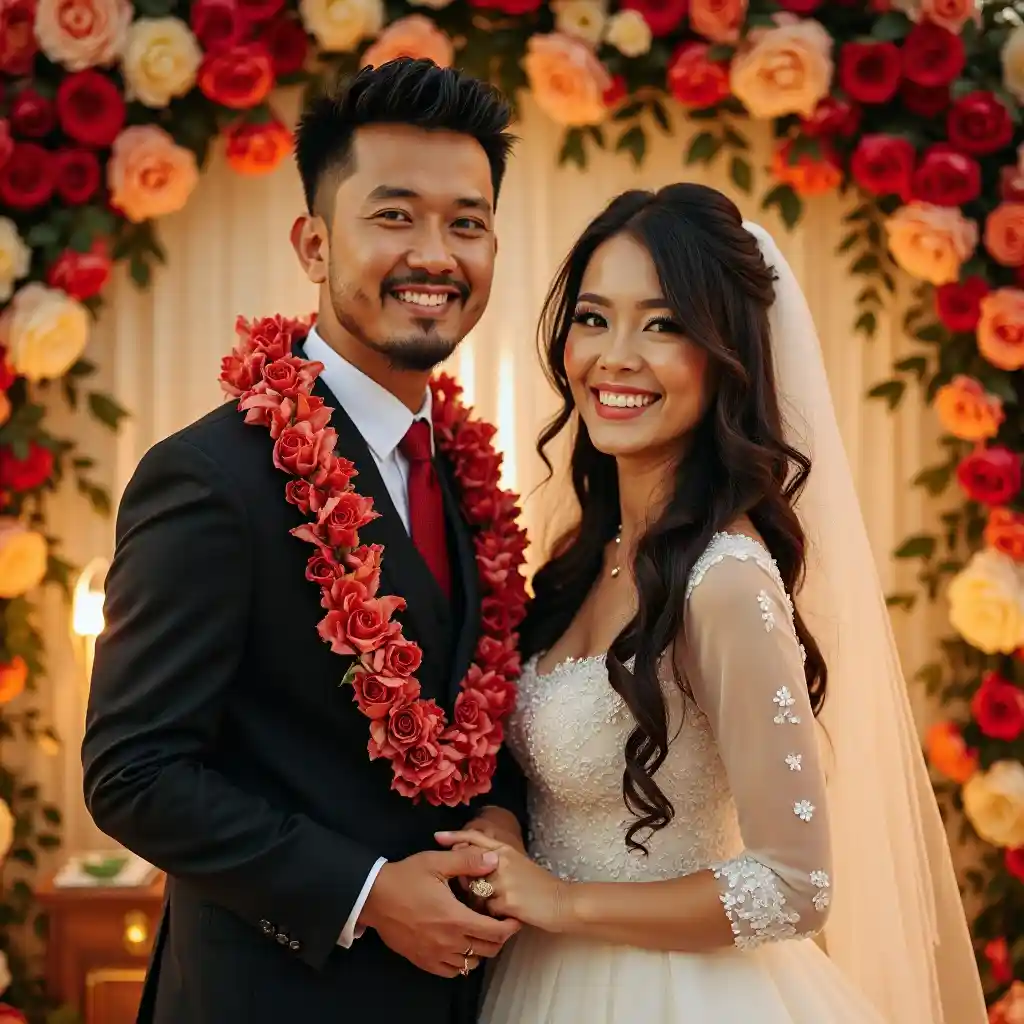 Wenzi wa ndoa wenye furaha wanasimama pamoja katika mazingira yenye msisimuko wa arusi, wakiwa wamepamba kwa maua yenye kupendeza ili kuanzisha uhusiano wa kimapenzi. Bwana - arusi, akiwa amevaa suti nyeusi yenye rangi nyangavu na shati jeupe na tai nyekundu, huvaa shati la maua la kitamaduni lililofanyizwa kwa waridi, huku bibi - arusi akipamba kwa mavazi yake maridadi ya rangi nyeupe na pazia lake, pia, limepambwa kwa shati la waridi. Nywele zake ndefu nyeusi huzunguka mabega yake kwa upole, na uso wake huonyesha furaha. Mahali pa nyuma pana maua mengi ya rangi mbalimbali, na hivyo kuchochea sherehe, huku mikono ya wenzi wa ndoa ikiambatana na kuonyesha umoja na upendo, na hivyo kuonyesha maana ya siku yao ya pekee. Mwangaza huo wenye joto huongeza msisimuko, na kuunda mandhari isiyosahaulika iliyojaa shangwe na kujitoa.