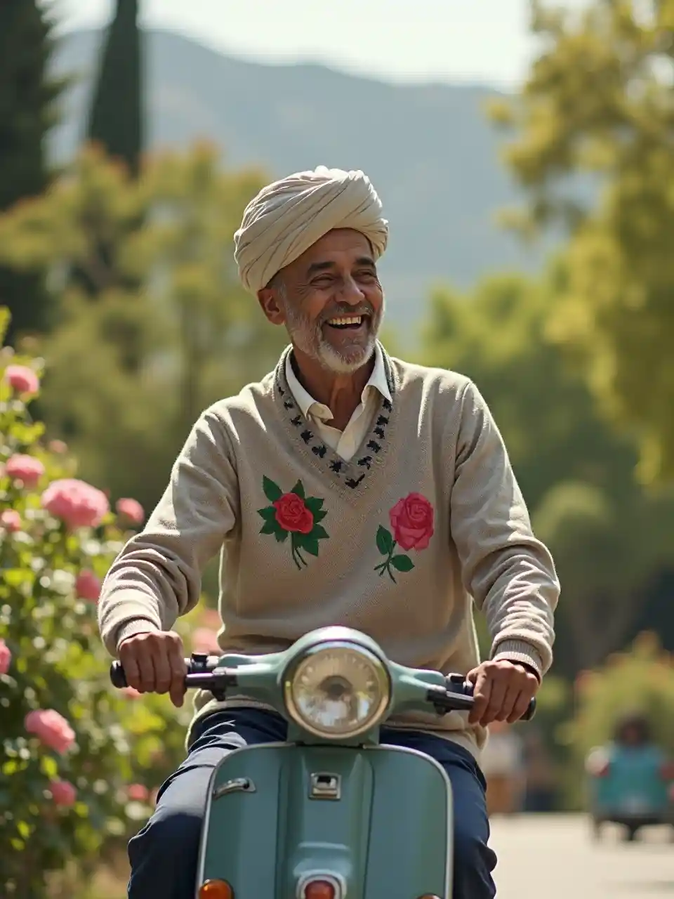 Akiwa katika bustani yenye jua, mwanamume mmoja mwenye umri wa miaka 77 kutoka Mashariki ya Kati akiwa na turban na sweta yenye vipande vya maua. Maua ya waridi na vilima vya kijani humweka katika mazingira, na mwendo wake wa polepole unatoa shangwe na utulivu katika jiji. Kicheko chake kinasikika kwa uhuru.