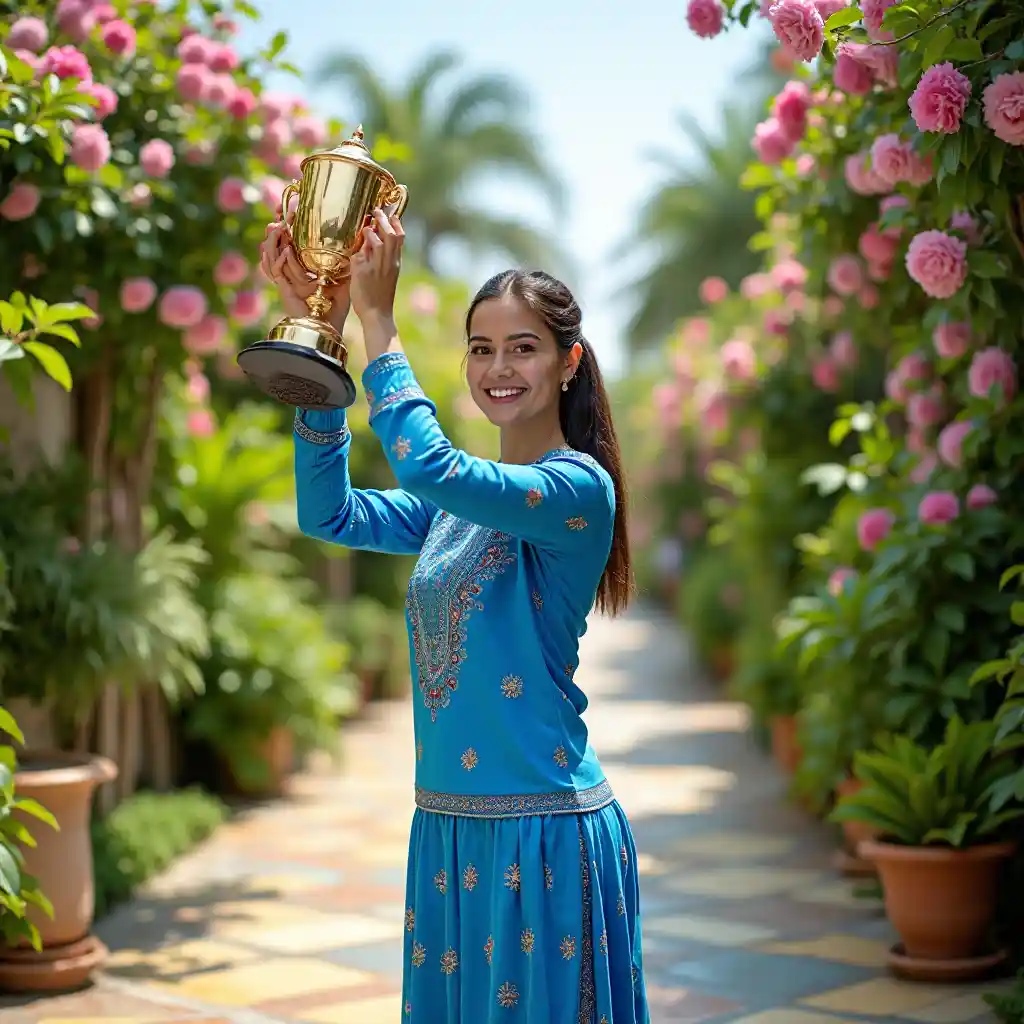 Mwanamke mmoja amesimama katikati ya mimea mingi na maua yenye kupendeza, akiwa na kiburi kwa kushikilia taji, akisherehekea mafanikio yake. Akiwa amevaa vazi la bluu lenye kupendeza na mitindo ya pekee, anaonyesha furaha yake na mafanikio yake. Maua ya waridi na mimea yenye majani huongeza msisimko, na vigae vyenye rangi huandaa mahali pazuri pa kutua. Hali ya hewa ni ya mafanikio na sherehe, ikiwekwa juu ya anga safi ambayo huongeza hali ya furaha ya wakati huo.