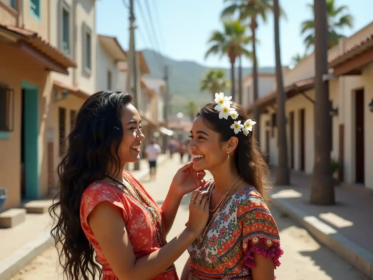 Wanawake wawili wamesimama nje katika mazingira yenye msisimko lakini ya kawaida, wote wakiwa wamepamba kwa maua meupe katika nywele zao, wakiongeza mavazi yao yenye nguvu ya kikabila. Mwanamke aliye upande wa kushoto, mwenye nywele ndefu nyeusi, anacheka kwa shangwe huku rafiki yake akipanga maua kwa njia ya mchezo, ikionyesha kwamba wana uhusiano wa karibu na kwamba watafurahia pamoja. Mahali hapo pana mandhari ya barabarani yenye majengo ya mashambani na mitende chini ya anga safi, ikionyesha siku yenye joto na jua. Picha hiyo inaonyesha hisia za uchangamfu na urafiki, ikionyesha uzuri wa urafiki katikati ya maisha ya kila siku.
