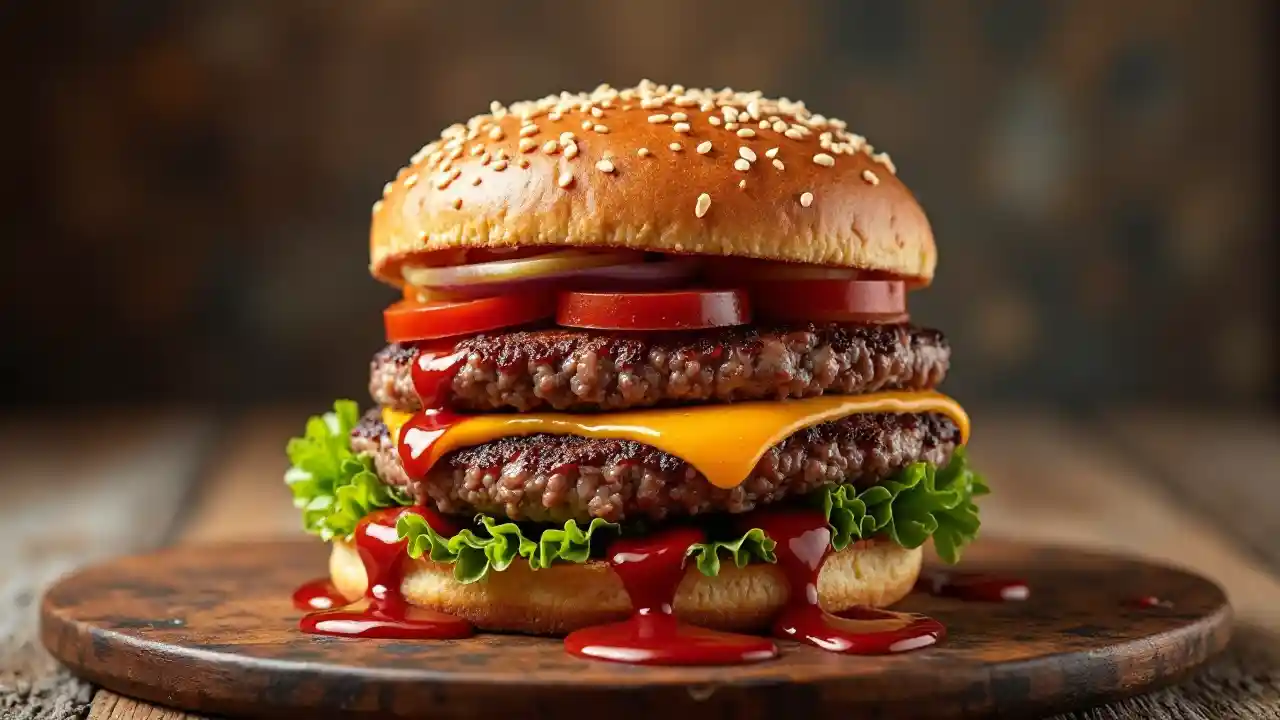 Burger kubwa yenye juisi, nyama ya ng'ombe, mchuzi unavuja